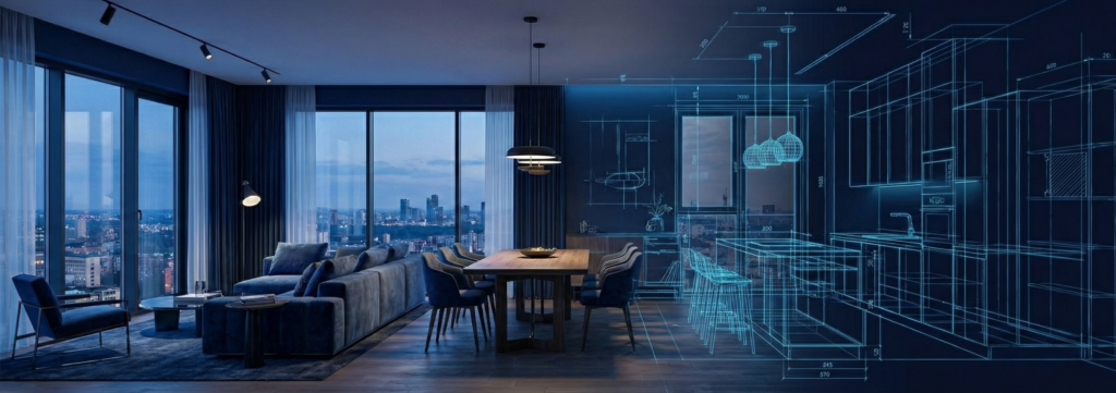 Wizualizację pomieszczeń wraz ze wsparciem w zakresie wystroju i doboru elementów i rozwiązań dostępnych na rynku mieszkaniowym